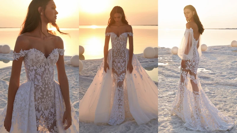 另一款婚紗則是由精緻的蕾絲製成,除了有慵懶的心形落肩領,貼臀的剪裁搭載透膚蕾絲面料超顯性感,此外,新娘可自行選擇組裝上半開方式的A字裙擺,抑或剛剛提及的透紗燈籠袖,添入迷人公主氣息。