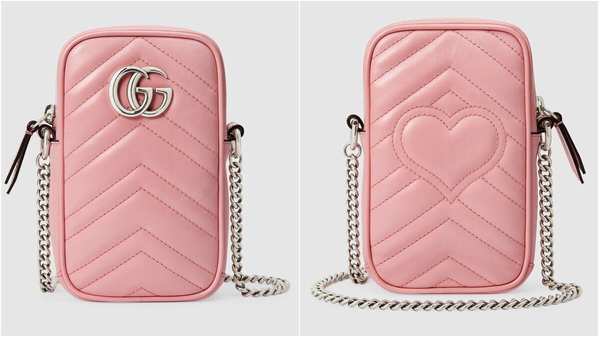 從Gucci的70年代典藏腰帶搭扣設計獲得靈感的GG Marmont系列,2020早秋推出的迷你手袋,採用柔和粉色人造麂皮,搭配經典雙G標誌,並偷偷在背後包身加入了心型圖案,展現品牌的匯集現代美學與俏皮的風格。除了粉色外還有白、綠、黑等三色可供挑選。(約NT28,500)