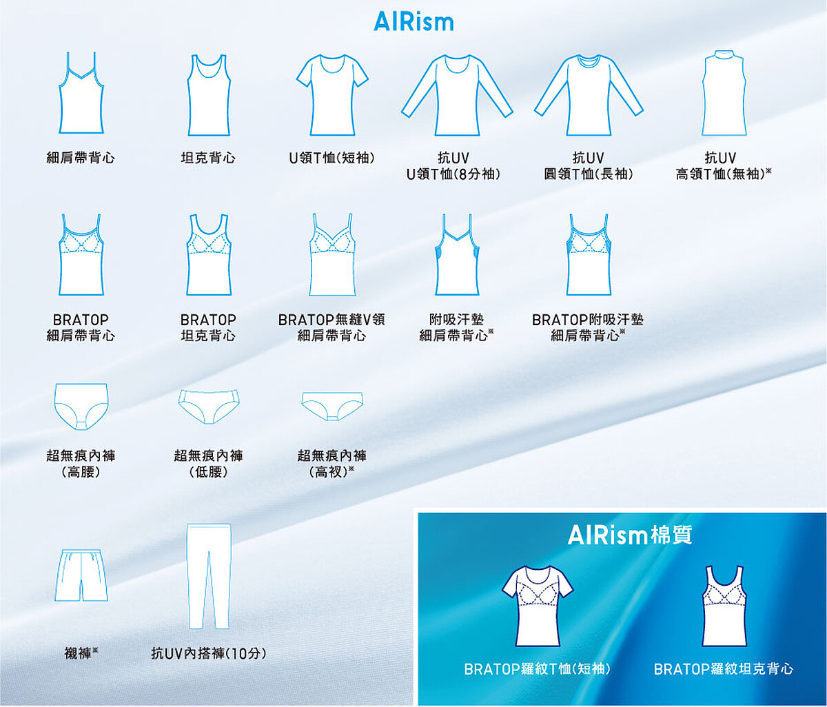 AIRisim系列商品不僅具備吸濕排熱、快乾、涼感、消臭、抗菌等機能功效,貼合身型的彈性面料與絲質般的滑順觸感更增添了造型時的搭配度,好比許多女孩會選擇在襯衫內穿上AIRisim背心,紓解流汗時的不適感,甚至單穿享受舒爽涼意,倘若覺得沒安全感的話,則可穿上一件防曬罩衫,使“內衣感”不那麼突兀,或者選擇黑色(白色款容易透出內搭胸罩)、霾霧藍和襯膚的裸色,展現幹練或氣質性格。