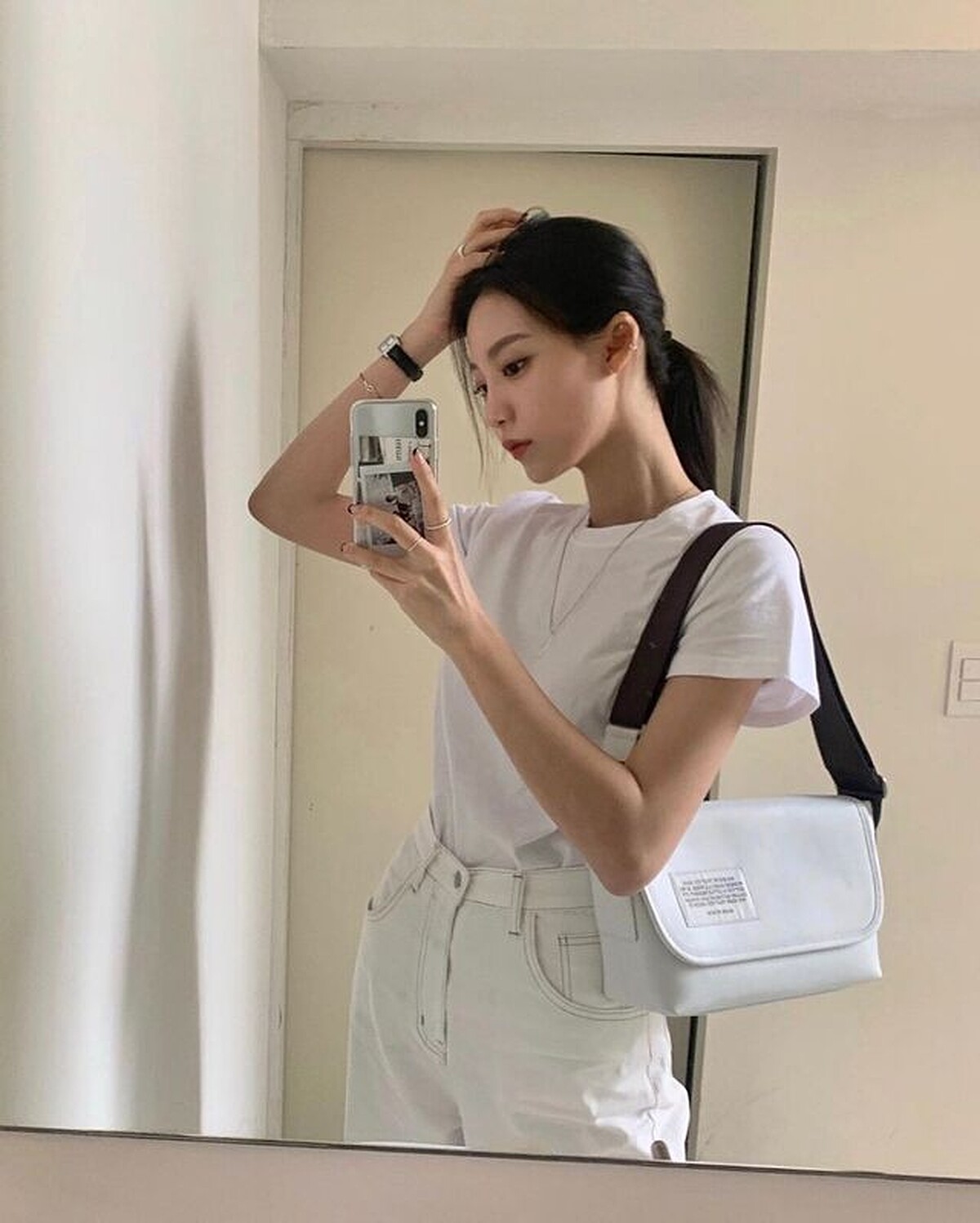 週一就用百搭的白 T-Shirt 做打底,合身但不緊身的尺寸最舒服,搭上一件牛仔褲後可將衣服下襬紮進去會顯得較有精神。一款具有份量感的包包能提升你的時尚度,雖然包包本身款式同樣簡約,但寬版的肩帶卻讓整體更加時髦。(photo source)