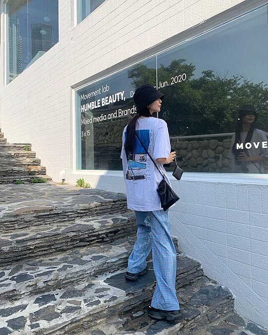 具有寬鬆輪廓的圖片 T-Shirt 在夏日特別適合穿著,輕盈自在又不悶熱,淺藍調的格紋寬褲不僅能阻隔熾熱的光線,視覺上也清涼了起來。如果你是位喜歡中性風格穿搭的女子,不妨透過深色系的運動鞋、側背包或鬱金香帽來增添個性的氛圍。(photo source)