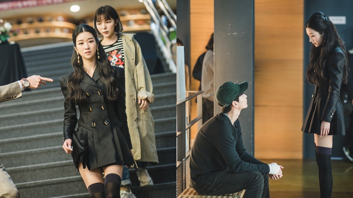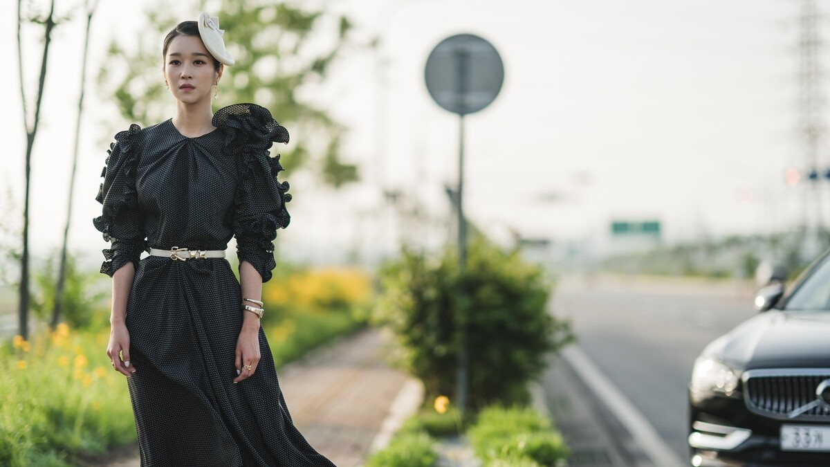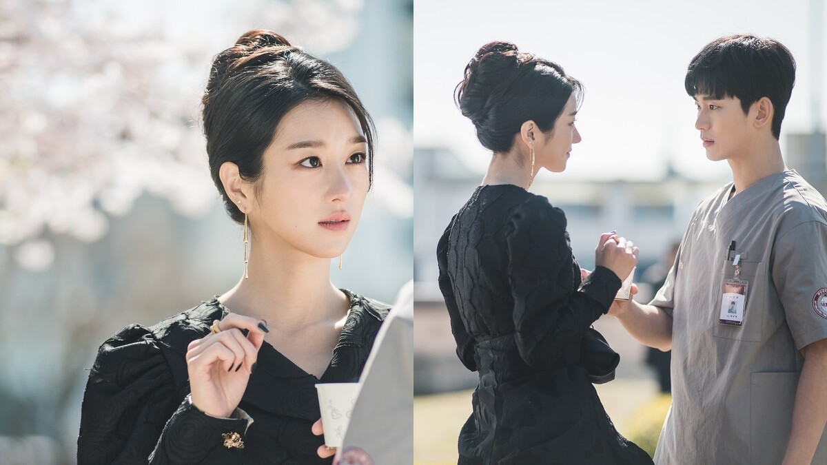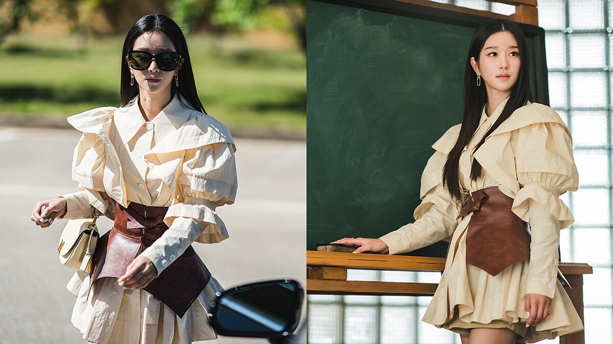 要到醫院為小朋友演講時,巧遇在醫院擔任看護工的男主角金秀賢,而她以一身黑色刺繡洋裝現身,墊肩設計、腰部裝飾加上袖口的金屬釦飾點綴,呼應她在劇中的魔女形象。