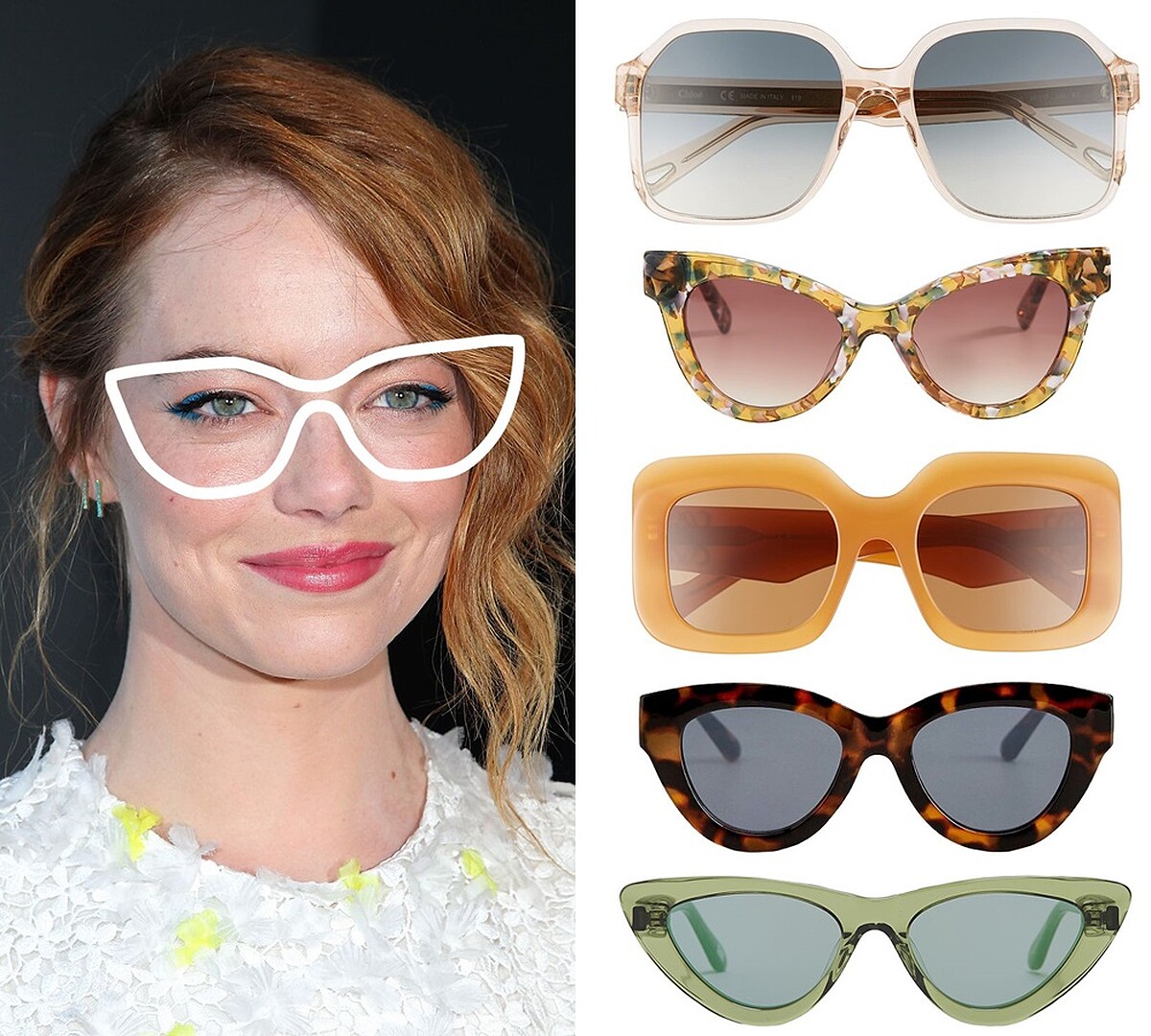 如果跟Emma Stone一樣是圓形臉,通常臉部的顴骨較寬,然後額頭以及下巴的部分較窄。所以像是方形鏡框和貓眼鏡框都是你不錯的選擇,因為較大的鏡框可以修飾圓形臉的寬顴骨。