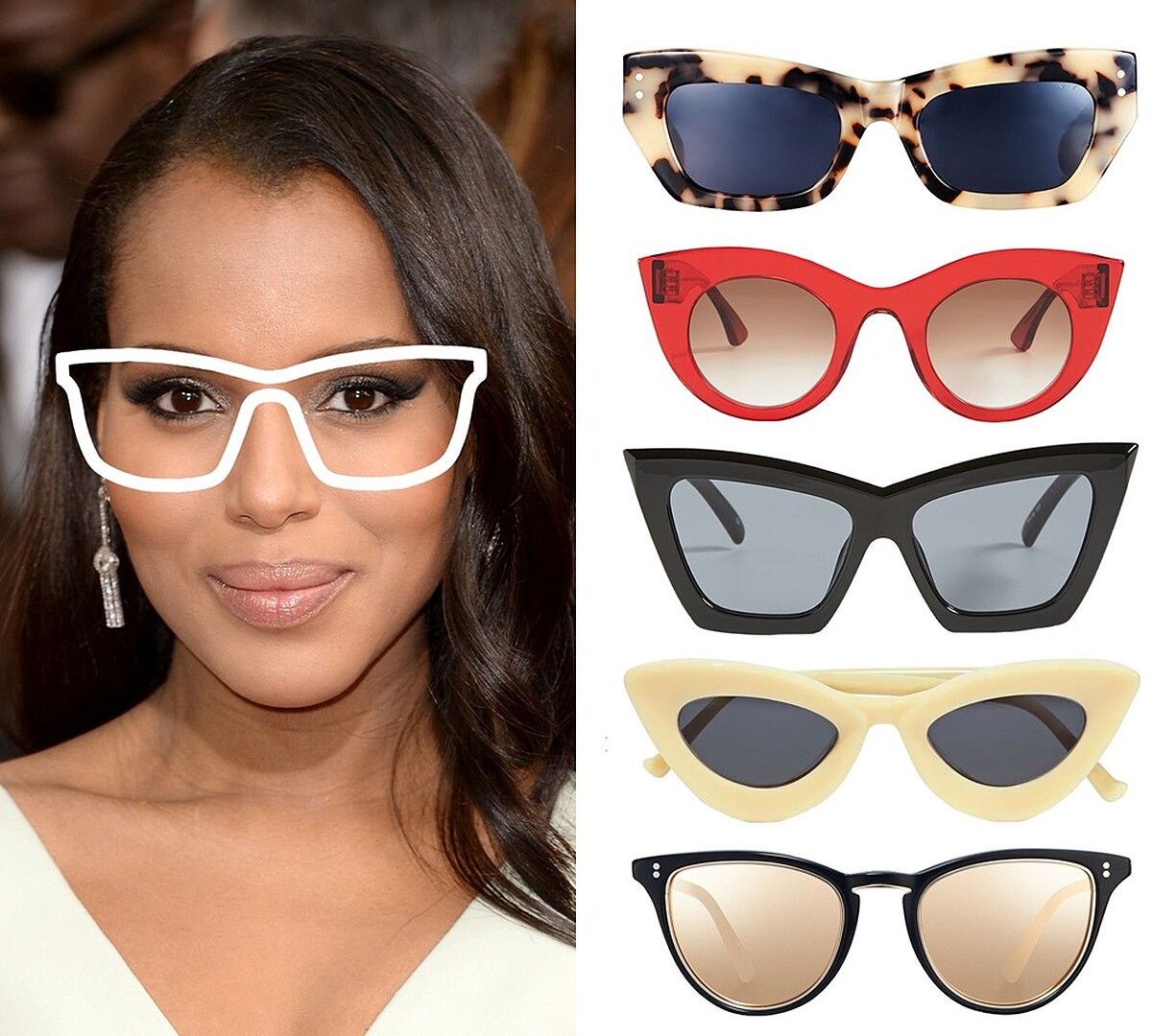 如果你是像Kerry Washington一樣,是屬於額頭較寬以及擁有尖下巴的心形臉的話。這代表著你能駕馭角度誇張的貓眼鏡框或是方形粗框,此外淺色系的鏡框也很適合你。