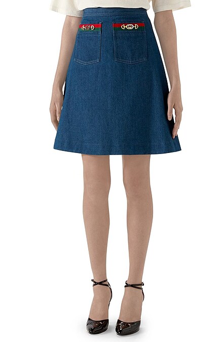 Gucci這款以70年代復古風格來設計的A字迷你裙,腰部配上具有品牌標識性的緞帶以及馬銜扣,讓它更顯魅力。