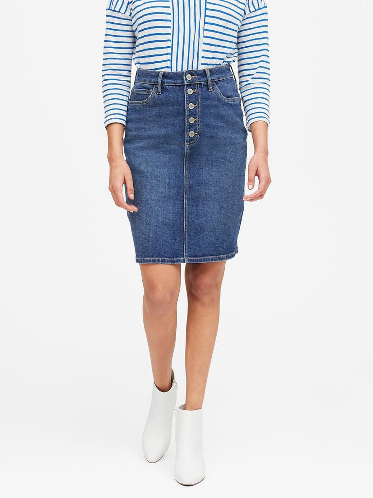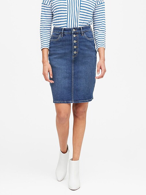這款扣式膝上的牛仔裙,不論是平時穿搭或是穿著正式服裝,都是一個很好的搭配單品。
