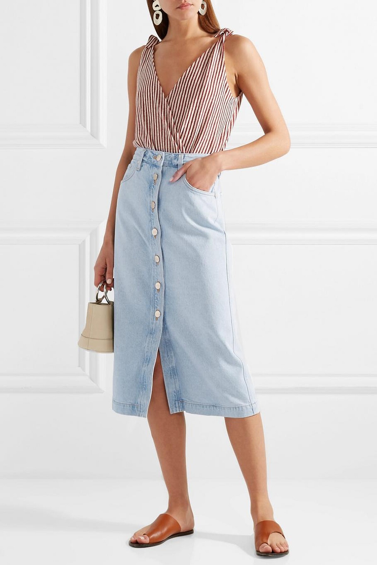 淺色牛仔丹寧面料加上特殊的前排鈕扣式設計讓這條裙子更加與眾不同。