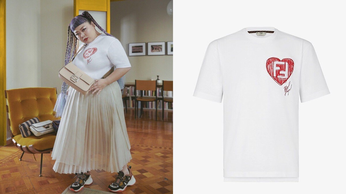 Fendi這款Karl Lagerfeld(老佛爺)限量版T恤,採短衣袖和船領設計,將品牌Logo透過隨性的筆觸置入於胸口上的紅色愛心中,搭配已故設計師老佛爺的簽名,不僅設計俏皮,也象徵著老佛爺在品牌心中不變的地位,極具收藏價值。(約NT$25,100)