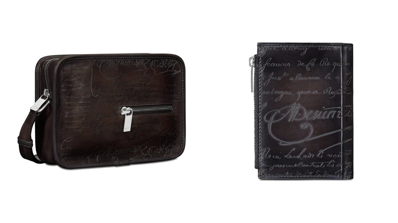 Berluti 全新推出的Periple Scritto冰黑色錢包,將品牌經典Scritto圖紋配置於皮件上,既低調又奢華,且包內配有6個卡片夾層及零錢隔層設計,是款實用時尚品味兼具的包款。另外,源自品牌典藏Jour包款系列的Journalier Scritto郵差包,重新演繹Un Jour Gulliver包款,捨棄手柄並以可調節的皮革肩帶代替,其配色上融合黑灰色(Nerogrigio)與棕色(Mogano),延伸出全新冰黑色(Ice Black)色彩,使整體視覺更加年輕化。Berluti Journalier Scritto 冰黑色郵差包,NT67,000、Berluti Periple Scritto冰黑色錢包,NT23,000