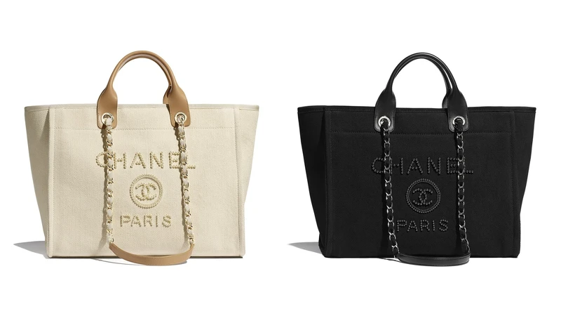 小香迷注意啦!Chanel這款經典原色托特包鑲有小顆幻象珍珠所拼出的品牌字樣,加上小牛皮背帶與金色鏈條,既奢華又不會太浮誇,其包內收納空間相當完善,包內更擁有一個拉鍊袋,且提供黑、白兩種顏色選擇,完全將品牌經典集結於一包。(NT116,100)