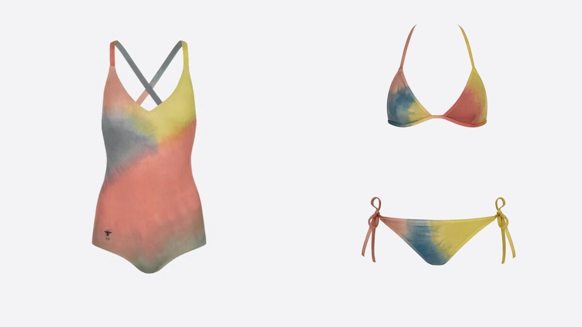 在2020夏季度假系列中,女裝創意總監Maria Grazia Chiuri以瑞士渥瑞塔山前瞻社區為靈感設計,打造出嶄新的Dioraura虹彩能量圖騰與紮染精湛工藝,並運用於服裝、包包、鞋履以及小配件系列,其中色彩繽紛的連身泳裝、比基尼,絕對是出國度假的必備品。(Dioraura連身泳裝,NT24,000、Dioraura比基尼泳衣,NT13,000、Dioraura比基尼泳褲,NT13,000)