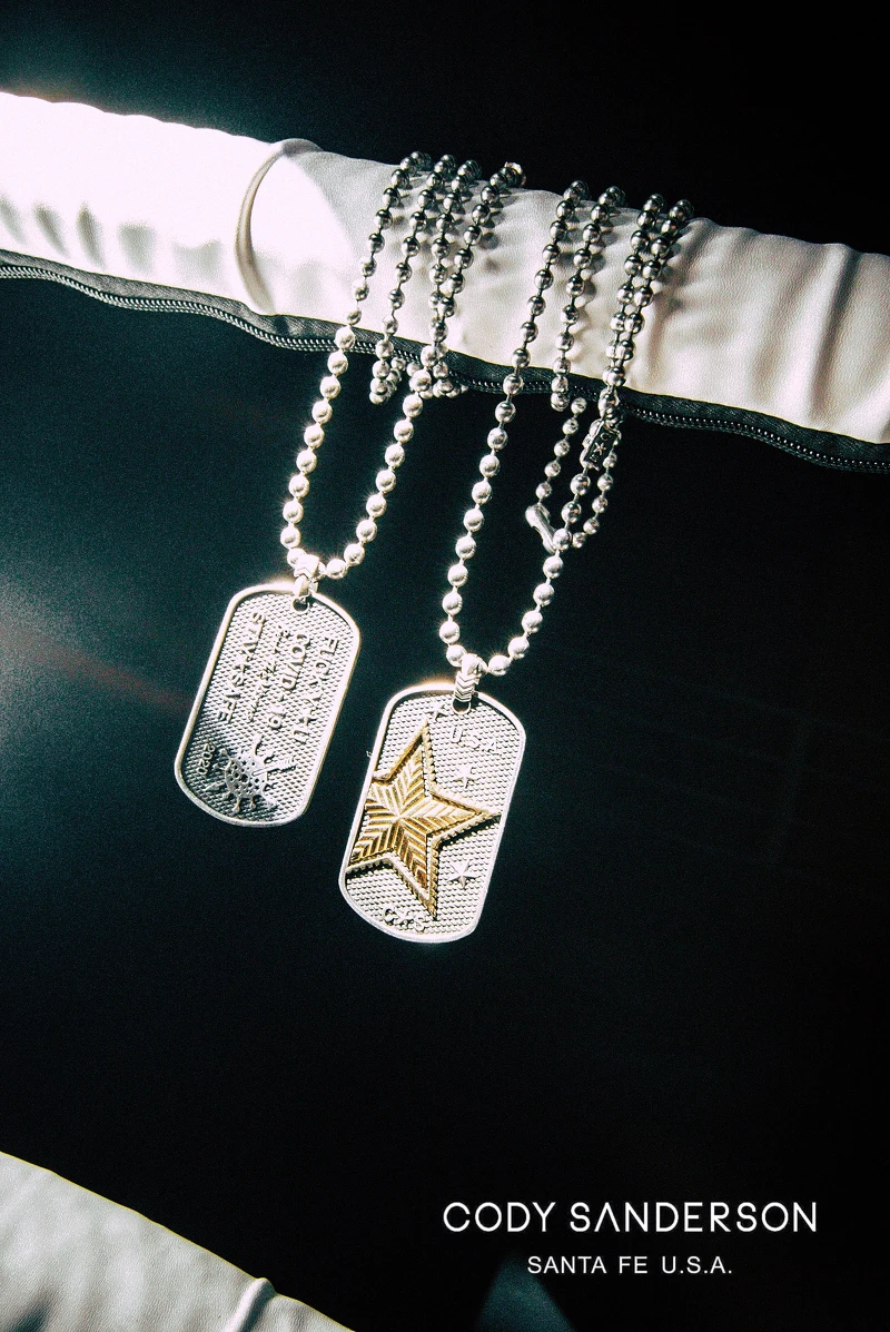 秉持經典的925採雙面配戴設計,除了延續一如既往的經典菱格手工敲花之外,在整體工藝細微處上更彰顯純熟技巧、細緻。純銀,以『軍牌』為主軸,象徵全人類一心對抗病毒如同軍人般的鋼鐵意志。雙向弓箭墜頭除了美觀,更是印第安戰士的代表象徵。