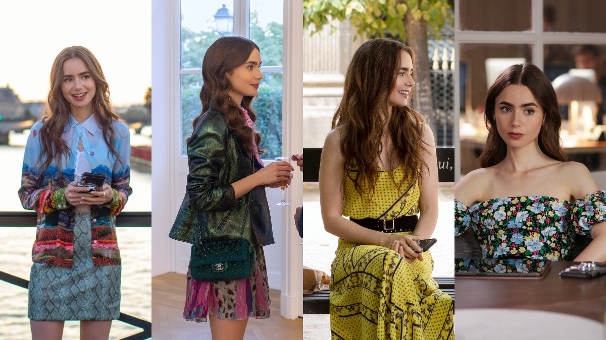 為了符合故事背景法國巴黎,又或許是多年來對於巴黎的嚮往,Lily Collins所飾演的女主角Emily,在造型上充分展現她對於美好未來的期盼,例如印花襯衫裙搭配粉色拼街外套、青蘋果綠毛呢大衣與同色系格紋裙...又或是繽紛色等配件,透過亮眼配色傳遞她對這份異國工作的熱情,另外像是千鳥格紋貝雷帽和花卉絲巾,這些極具法式風情的配件,都足以彰顯Emily對巴黎的喜愛。