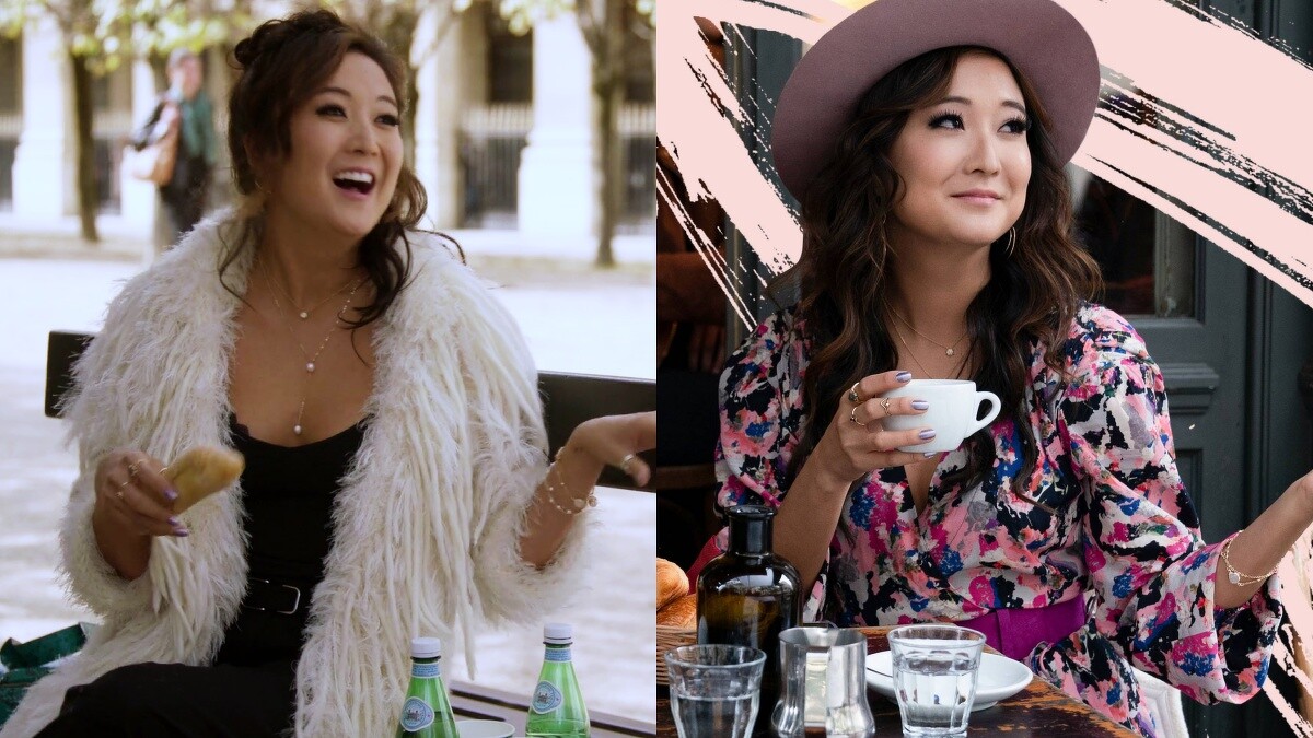 劇中飾演Emily在巴黎結交的第一位朋友的Mindy(Ashley Park飾),相較於Emily的穿搭風格,Mindy相對成熟許多,時常以霧粉、天藍等溫柔色系亮相,又或者透過純色系單品搭配印單一花印服裝,平衡過分花俏的整體質感,同時不忘以珠寶點綴自身華麗品味。