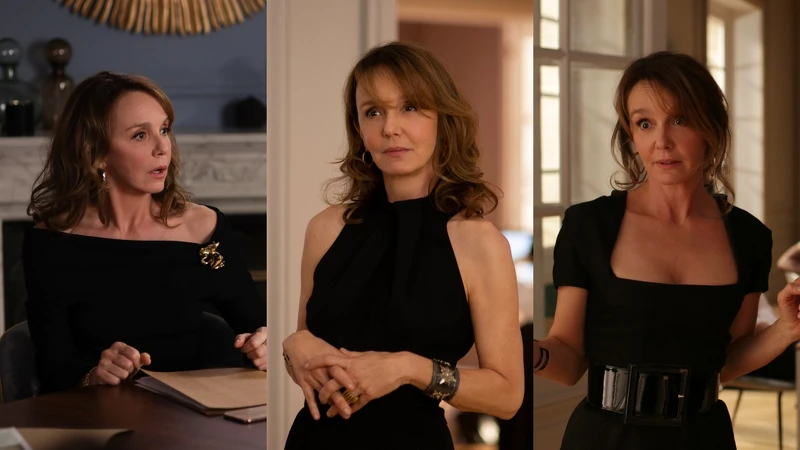從談吐到穿著風格,Sylvie(Philippine Leroy-Beaulieu飾)完美詮釋出典型的法國女性形象。造型上從配色、剪裁到配件的挑選,皆可看見Sylvie講究的「法式美學風格」,好比身穿船型領長袖洋裝時,Sylvie會特地於左胸領口別上貴氣的金銅胸針,又或者在優雅的黑色小禮服上繫上霸氣的漆皮寬腰帶...透過細節巧思突顯絕佳的審美觀點。
