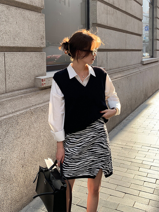 搭編個人喜歡以針織材質的斑馬紋中長裙,配上白色襯衫和黑色針織背心,打造知性又溫柔的黑白穿搭,同時又能散發一些些時髦感,無論穿去哪個場合都很適合。(圖片來源)