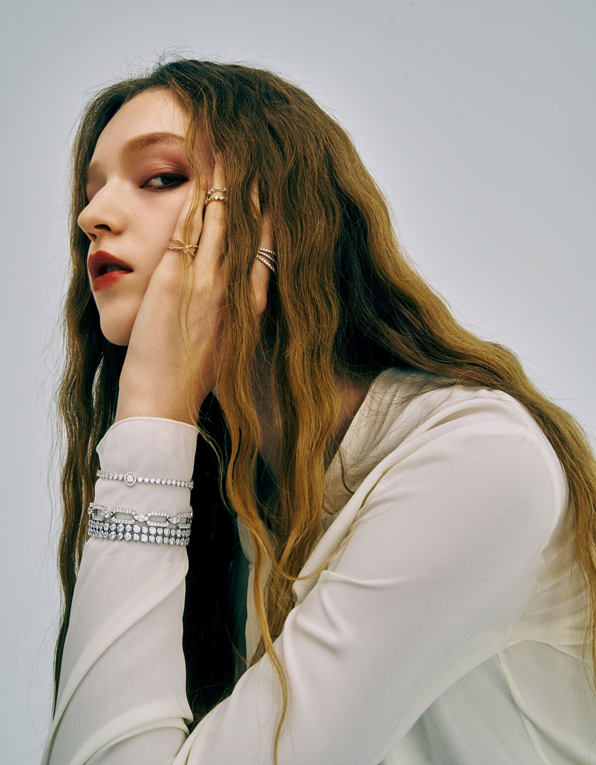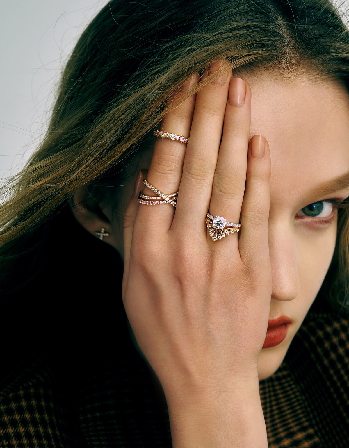 耳環:HARLEY XO玫瑰金鑽石耳環(大型款式)。戒指(左至右):BEHATI BEADED玫瑰金鑽石戒指/ HARLEY WRAP玫瑰金鑽石與粉紅剛玉戒指、SLOANE SILHOUETTE白K金鑽石戒指 主鑽1ct/ BEHATI SILHOUETTE玫瑰金鑽石戒指