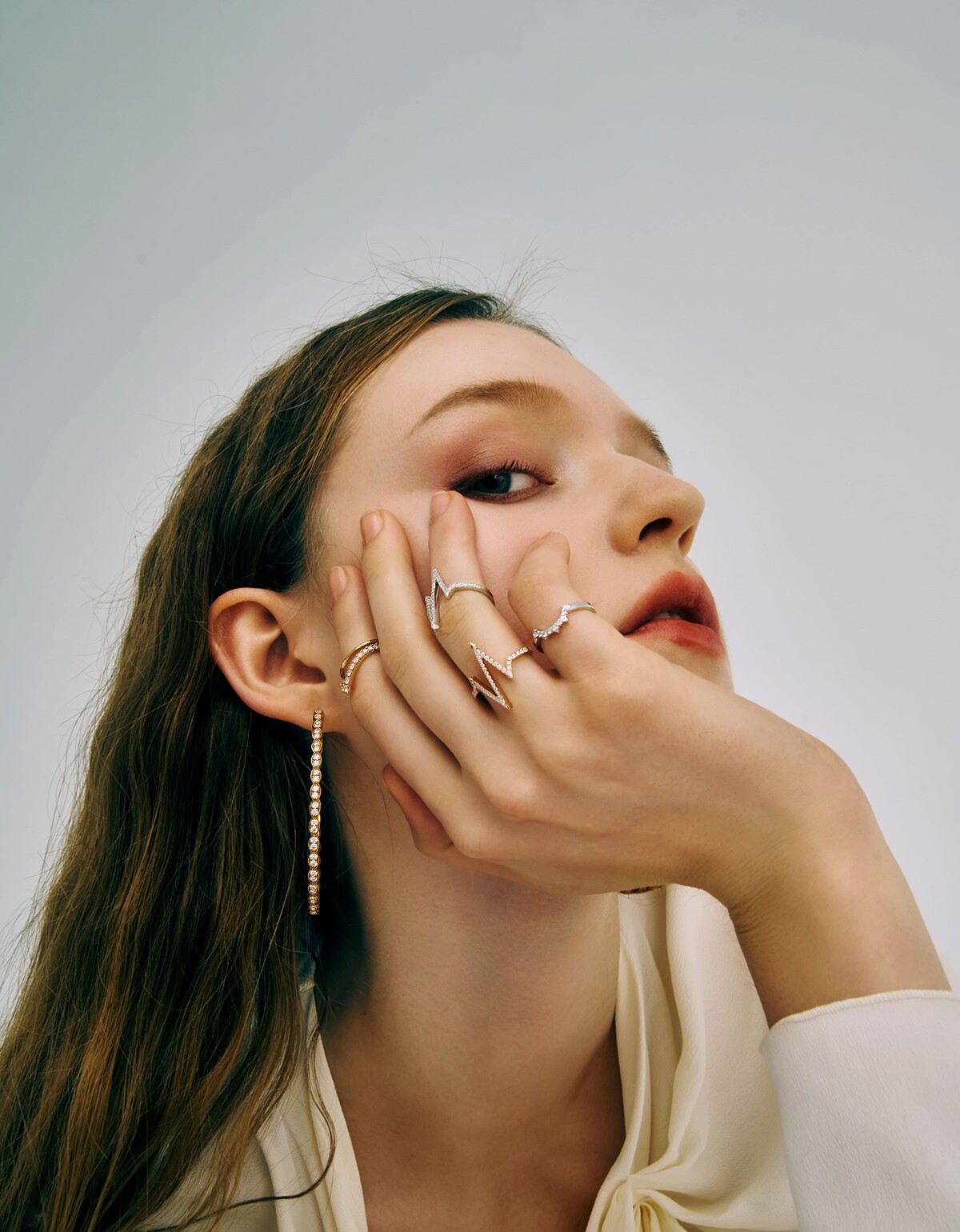 耳環:LORELEI黃K金鑽石環狀耳環。戒指(左至右):HARLEY SILHOUETTE玫瑰金鑽石戒指、LOVE CODE HEARTBEAT白K金鑽石戒指/ LOVE CODE HEARTBEAT玫瑰金鑽石戒指、BEHATI TIARA白K金鑽石戒指