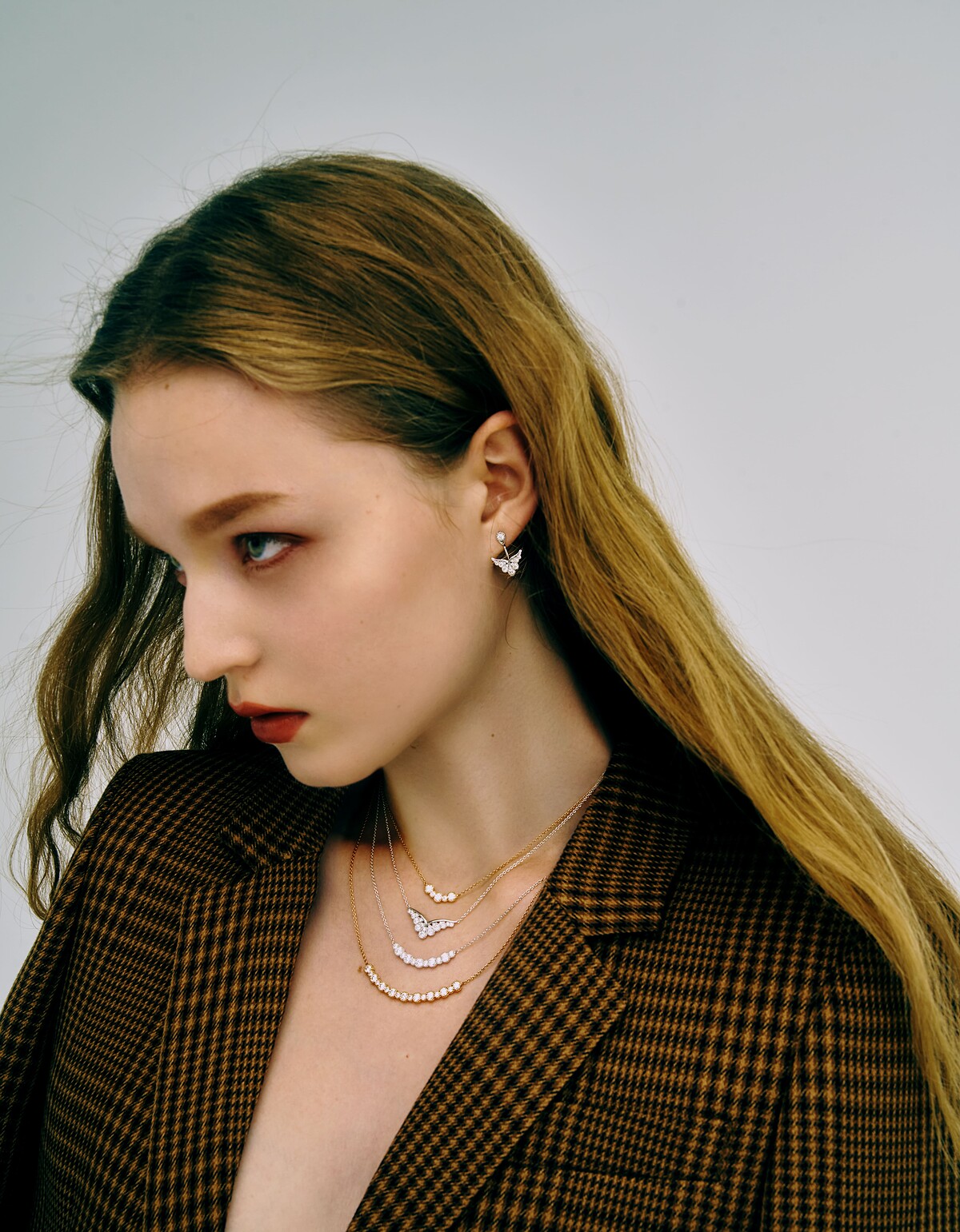 耳環:BEHATI SILHOUETTE白K金鑽石耳環。項鍊(上至下):BEHATI BEADED玫瑰金鑽石項鍊(小型款式)、BEHATI SILHOUETTE白K金鑽石項鍊、BEHATI BEADED白K金鑽石項鍊(中型款式)、BEHATI BEADED玫瑰金鑽石項鍊(大型款式)