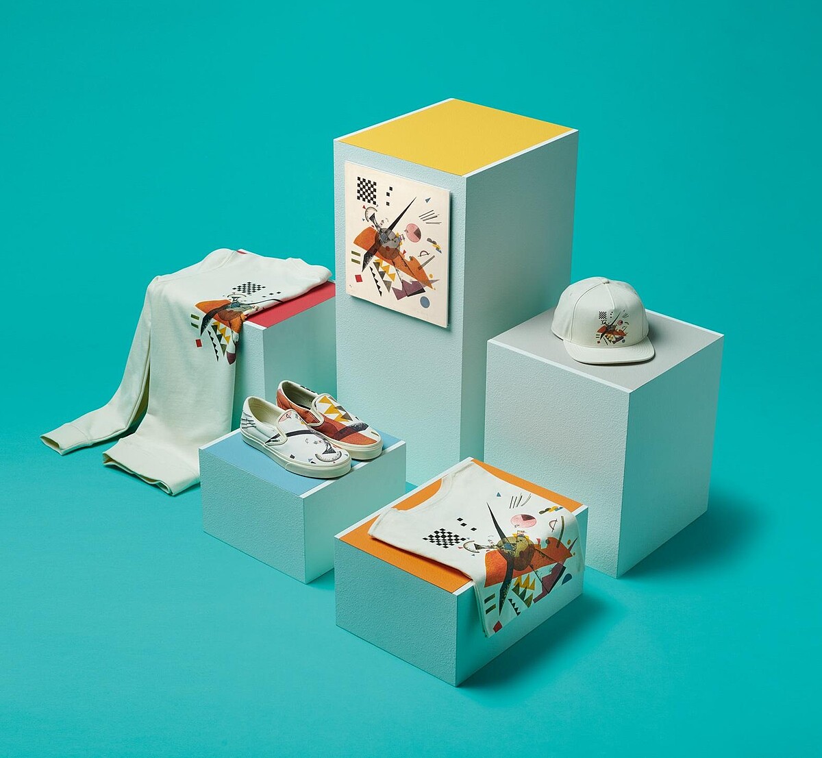 抽象藝術先驅Vasily Kandinsky認為色彩與形態都可以激發出自身的力量和情感,與圖像和物體無關。Slip-On鞋款挑選了他1923年在德國包浩斯藝術與設計學院任教時所創作的《Orange》,來表揚Vasily Kandinsky對抽象和形態的研究,畫作覆蓋了整個帆布鞋面,其他服飾單品也同步融入呼應,中性色調與獨具一格的畫作,一穿上就自帶與眾不同的潮品味。
