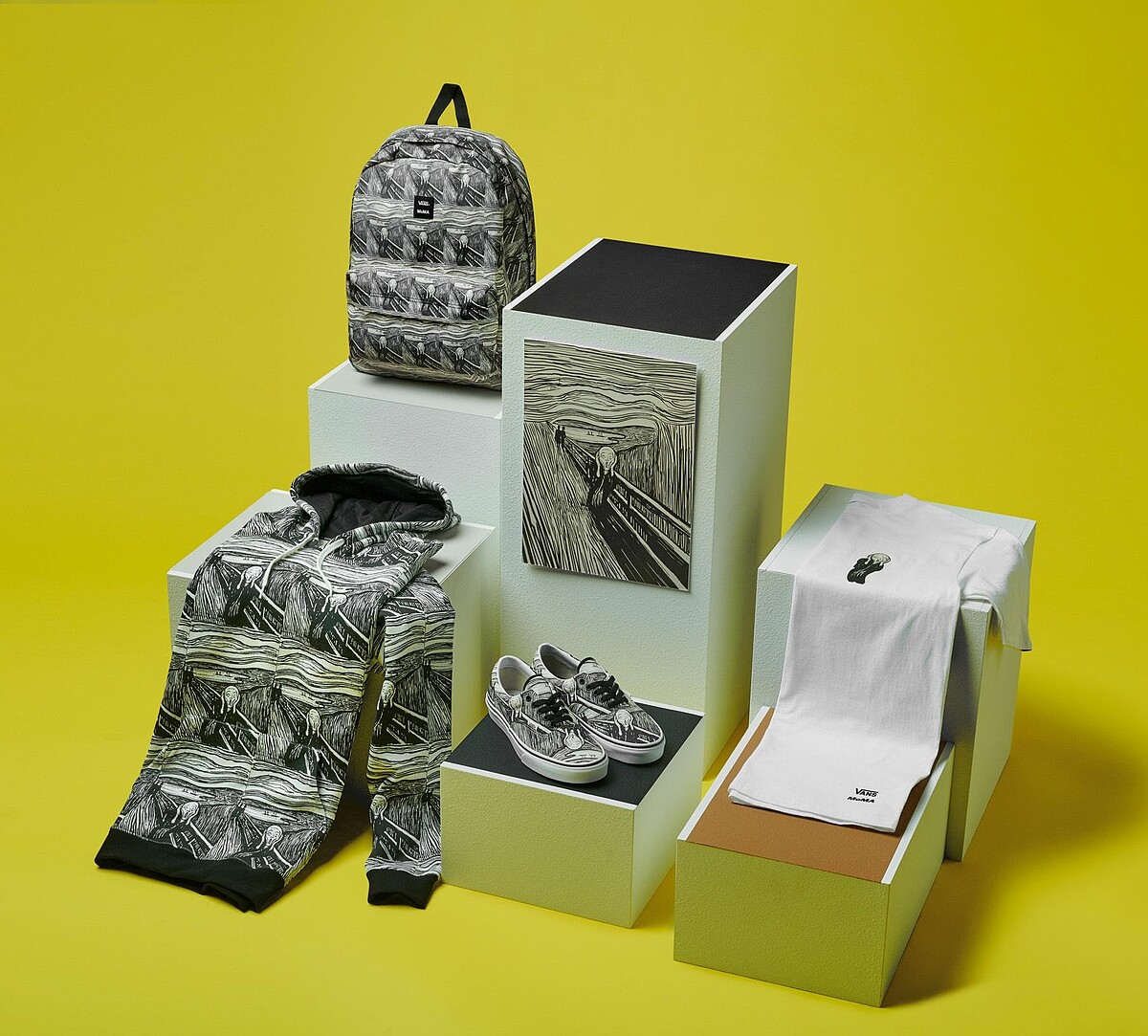 Edvard Munch最舉世聞名的作品1893年《The Scream吶喊》,強烈的存在性焦慮、表現主義繪畫風格,都重現於Era鞋款、服飾及配件商品中,黑白個性色調,混搭各種單品都能輕鬆就彰顯出屬於自己的存在感,與藝術創意作出完美的呼應。