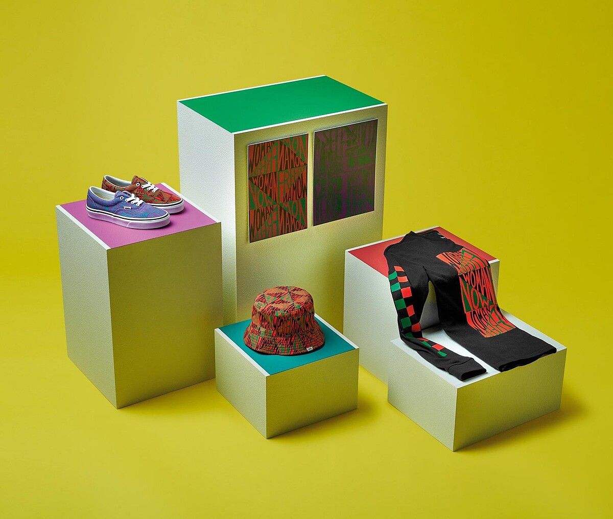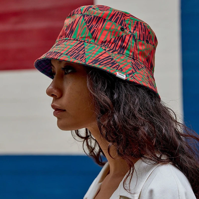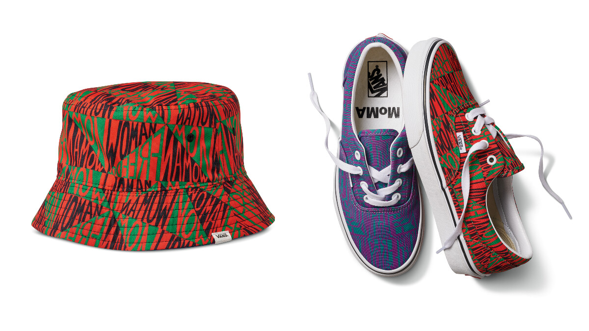 Faith Ringgold有著畫家、作家、雕塑家、表演者、教育家和活動家的多重身分,作品大多突出她在種族主義和社會不公方面的經歷,MoMA藝術館館長與Ringgold合作緊密,這次重新演繹了她的女權主義海報藝術,包括《Woman Free Yourself 1971》與《Woman Freedom Now 1971》,作品中大膽的字體藝術分別出現在Era的左右腳、雙面配戴的漁夫帽與長袖Tee之中,表達Angela Davis在被捕期間的正面訴求,濃厚藝術張力令人過目難忘。