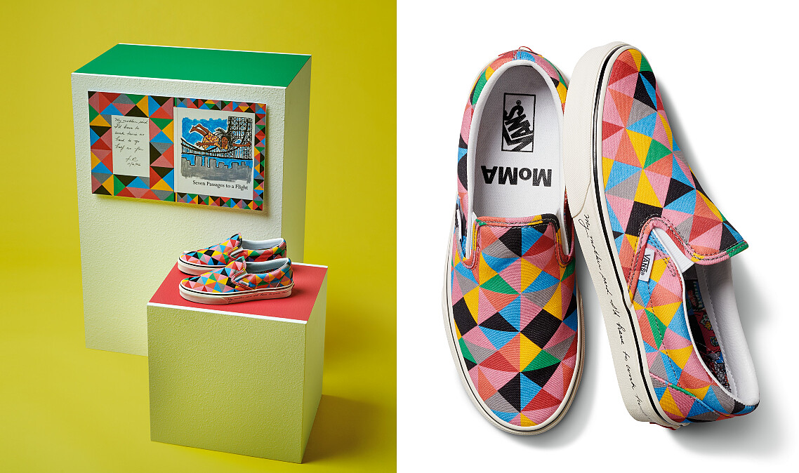 Classic Slip-On鞋身設計靈感來自Ringgold的第一批抽象畫系列,1970創作的《The Windows of the Wedding》,中底鞋側則引用了他手寫的字句:「My mother said I’d have to work twice as hard to go half as far」,是在細節上擁有精緻巧思的人氣鞋款。