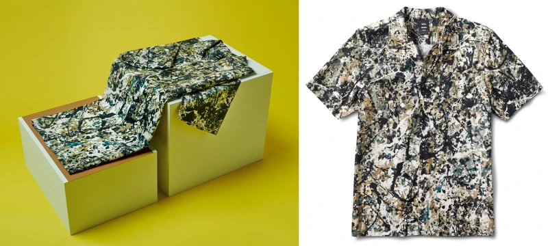 行動繪畫的先驅Jackson Pollock,將油漆繩扔到油畫上進行創作是他聞名的特色,將這創作圖案運用在數碼印刷的短袖襯衫上,以忠實還原創作的服裝來完整傳達藝術家本身的美學理念,也和近幾年大熱的Outdoor風格穿搭頗為相襯。