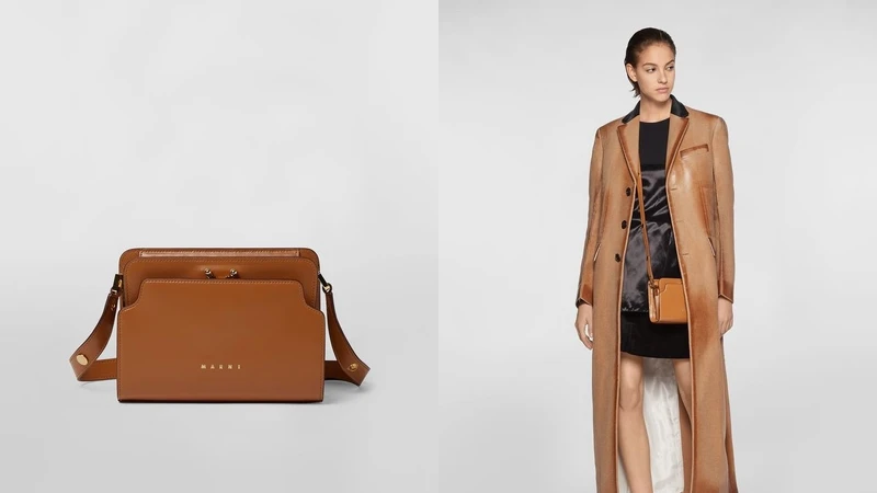 來自義大利的Marni,明星包款Trunk Reverse肩背包,選用Nappa小牛皮革搭配金屬細節,結合大勢的焦糖棕配色,是一款百搭又實揹的手袋選擇。(約NT56,000)