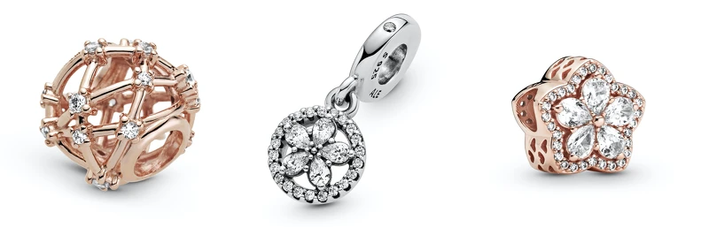 Pandora Rose璀璨星辰鏤空串飾NT$2,080,星鑽雪花925銀吊飾 NT$1,880、Pandora Rose星鑽雪花串飾 NT$3,280。