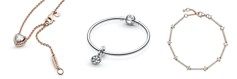 Pandora Rose璀璨之心項鏈NT$5,380,星鑽雪花925銀吊飾NT$1,880、Pandora Rose璀璨星鑽手鏈NT$5,380。