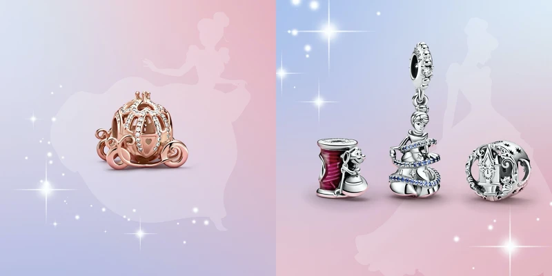 Disney Cinderella玫瑰金南瓜馬車串飾NT3,680、Disney Cinderella 裁縫小幫手蘇西串飾NT$2,080、Disney Cinderella 魔法時刻吊飾NT2,880、Disney Cinderella午夜中的南瓜馬車串飾 NT$1,580