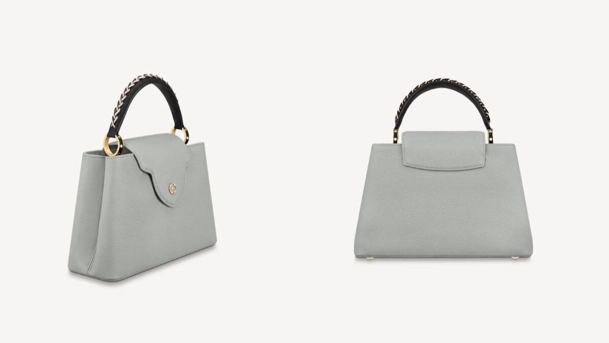 有明星手袋之稱的Capucines包款穿上沉穩灰色,配上皮革編織手提把,低調又奢華,翻蓋式開口設計可以內收也可外露,貼心為不同造型增添穿搭風格。(NT201,000)