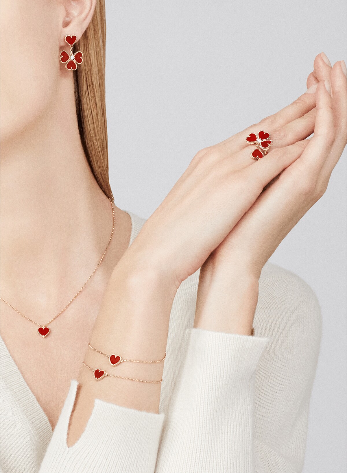 Van Cleef & Arpels(VCA)梵克雅寶尺寸最迷你、最可愛!Sweet Alhambra 系列是四葉幸運草家族中造型最小巧的,以愛心搭配甜美又襯膚色的棕調紅色玉髓,實在萌得太欠收。