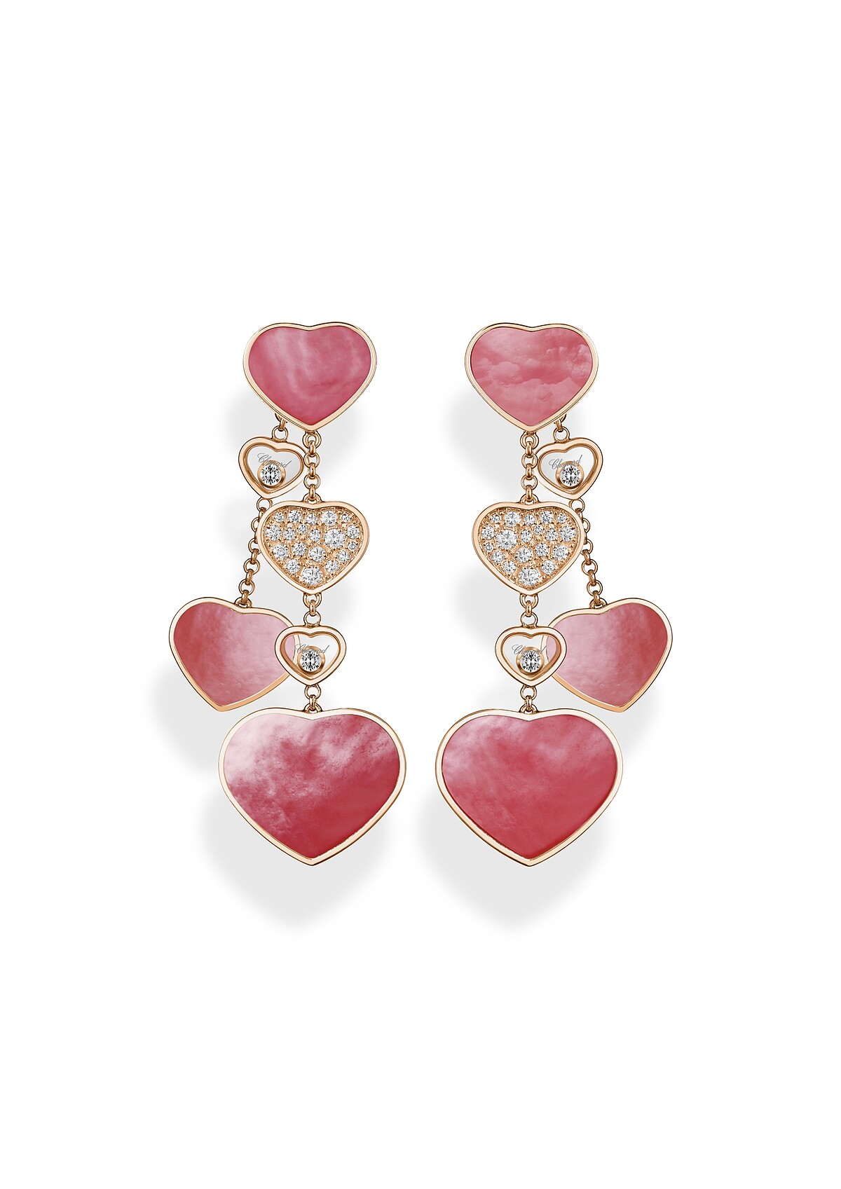 Happy Hearts系列耳環,18K玫瑰金鑲嵌粉色珍珠母貝與鑽石,搭配四顆滑動鑽石,售價NT509,000