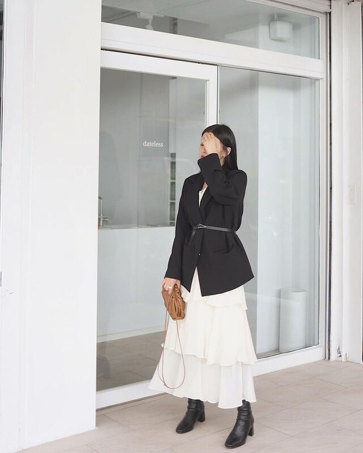 相信有在 Follow 夢露的人都知道她是個超級西裝外套控,為了讓西外穿搭不要太過正式,同時又為穿搭添加精緻細節,夢露會選擇以異材質的單品搭配顏色較重的西裝外套,像是黑色西外搭配雪紡蛋糕裙洋裝、針織洋裝等,同時也會挑選稍微寬鬆一些的版型,中和掉西外給人的嚴肅感。(圖片來源)