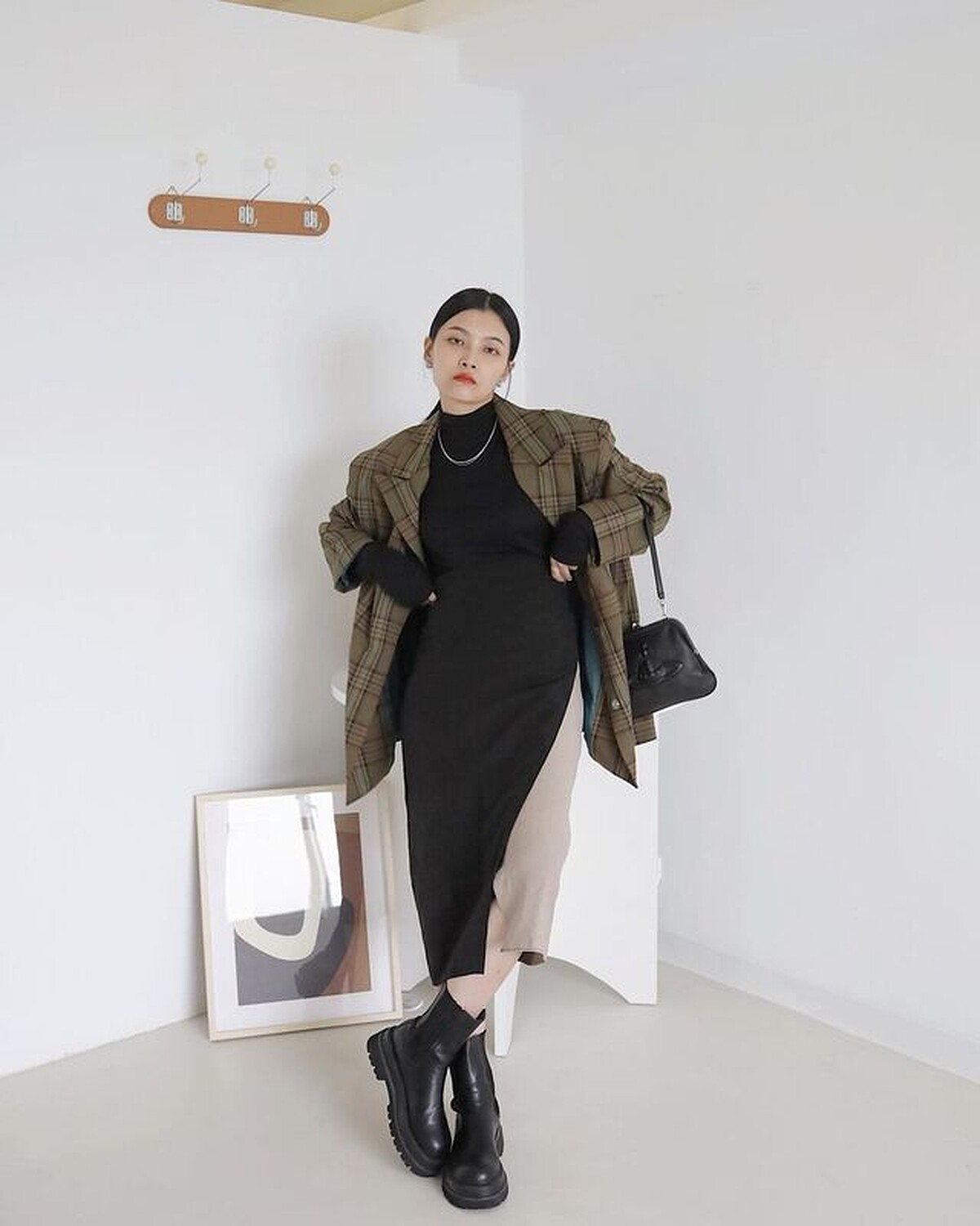 偶爾發懶不想挑選太複雜單品時,也可以像夢露一樣以格紋的微墊肩西裝外套搭配針織黑色連身洋裝,再踏上近來最流行的切爾西厚底靴,讓你整個人看起來時髦得毫不費力。(圖片來源)