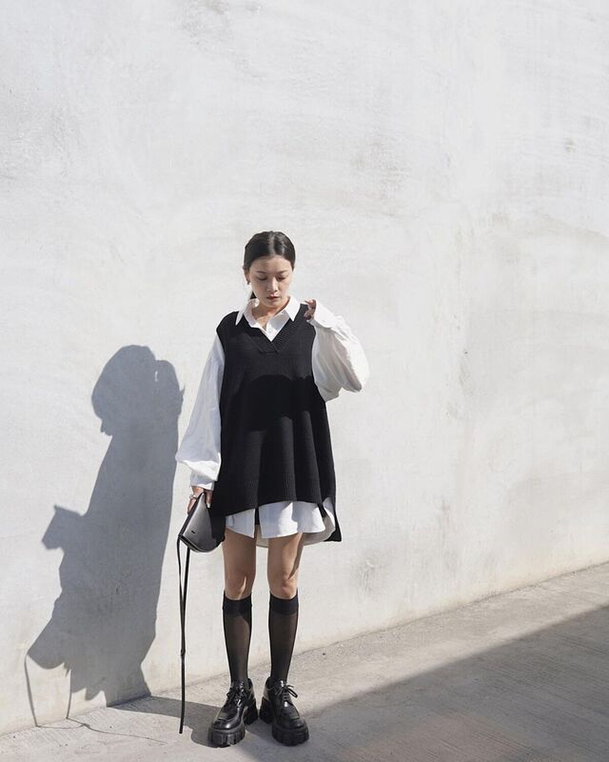 相較於比較偏日系的「上寬下寬」休閒風,成熟又帶點俏皮的上寬下窄姊姊風穿搭更適合 25 歲以後的妳,下次想嘗試男友風襯衫時,不妨像夢露一樣以長版的針織背心外搭,增加穿搭層次感,再配上長襪和厚底鞋,將腿部線條完整展現出來,即便穿得寬鬆也能看起來女人味十足。(圖片來源)