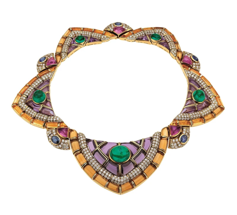 寶格麗Heritage典藏系列彩寶項鍊,於1991年完成,過去曾為Yasmin Aga Khan公主的收藏品。以黃K金製作項鍊骨架,鑲嵌5顆橢圓蛋面切割哥倫比亞祖母綠(總重約34克拉,分別重約2.97克拉、7.87克拉、14.37克拉、6.56克拉及2.82克拉) 、5顆橢圓形混合切割藍寶石(總重約6.5克拉)、32顆花式切割紫水晶、48顆花式切割黃水晶、5顆花式切割紅碧璽與747顆圓形明亮切割鑽石(總重約27.84克拉)。