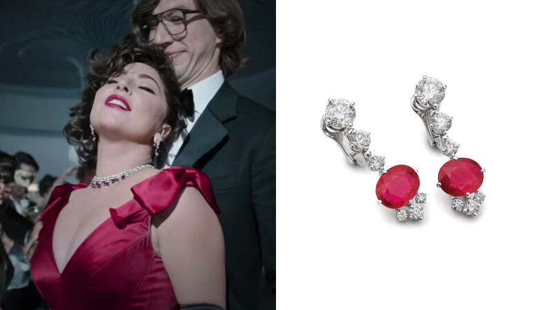而在Patrizia Reggiani與夫婿熱舞時,還可以瞥見他搭配了同系列的耳環,上面的珠寶為鑲嵌2顆橢圓切割莫三比克鴿血紅紅寶石(分別重約5.04克拉、4.15克拉)、2顆明亮切割鑽石(H VVS2,重約1.50 克拉 - H VVS2,重約1.51 克拉)。