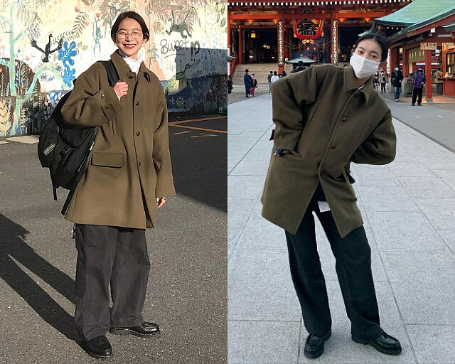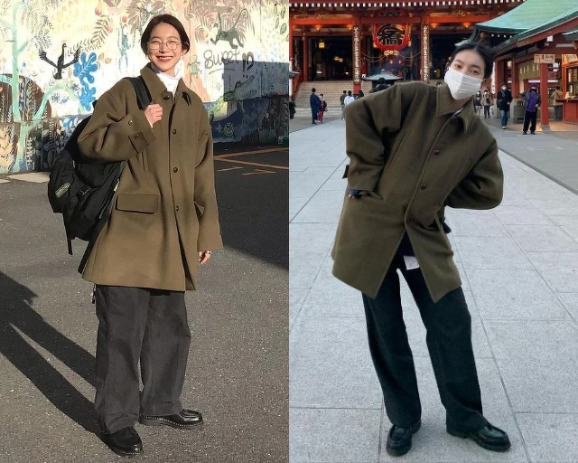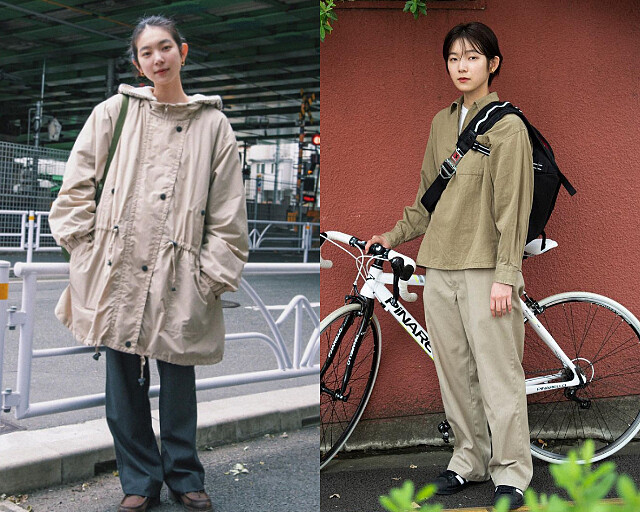 一身 oversized 的卡其色軍事改良風衣外套,配上霧藍色的直筒西裝褲,再踏上一雙仿舊感的棕色袋鼠鞋,整體色系休閒卻又不失質感。深卡其色帶點橄欖綠的開襟上衣,拉鍊微開露出內搭的白色上衣,既休閒又有層次;下身著用直筒卡其褲,微微落地帶出休閒隨性,再選用一雙黑色休閒版鞋,背上大大的斜跨包,輕鬆演繹城市女孩感。