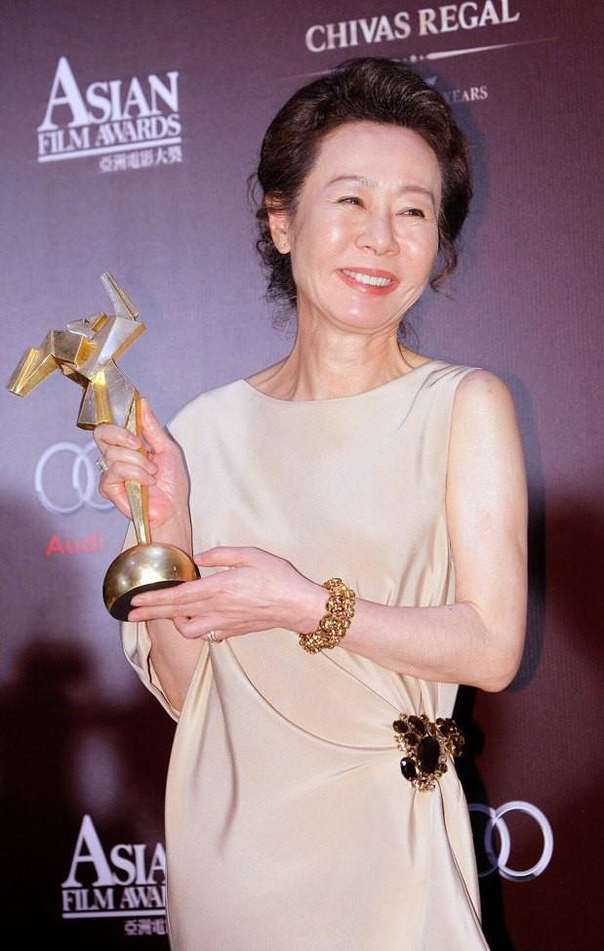 隔年再以電影《下女》獲得亞洲電影大獎最佳女配角獎,尹汝貞選擇帶有光澤的米色禮服出場,腰間綴以珠寶飾品,更顯女人味。