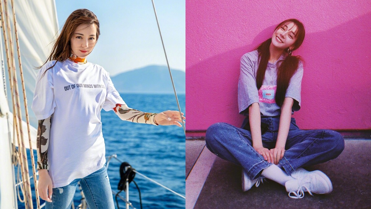 眾多T-Shirt的選擇中,除了簡單素面款式外,可以遮掉上手臂的五分袖T-Shirt,是她最常搭配的選擇,不想露太多手臂部位的你,可以像迪麗熱巴一樣選擇寬鬆五分袖設計,將不想見人的蝴蝶袖藏起來,下半身搭配直筒牛仔褲或刷破牛仔褲,不僅修飾了身材曲線還十分有型。