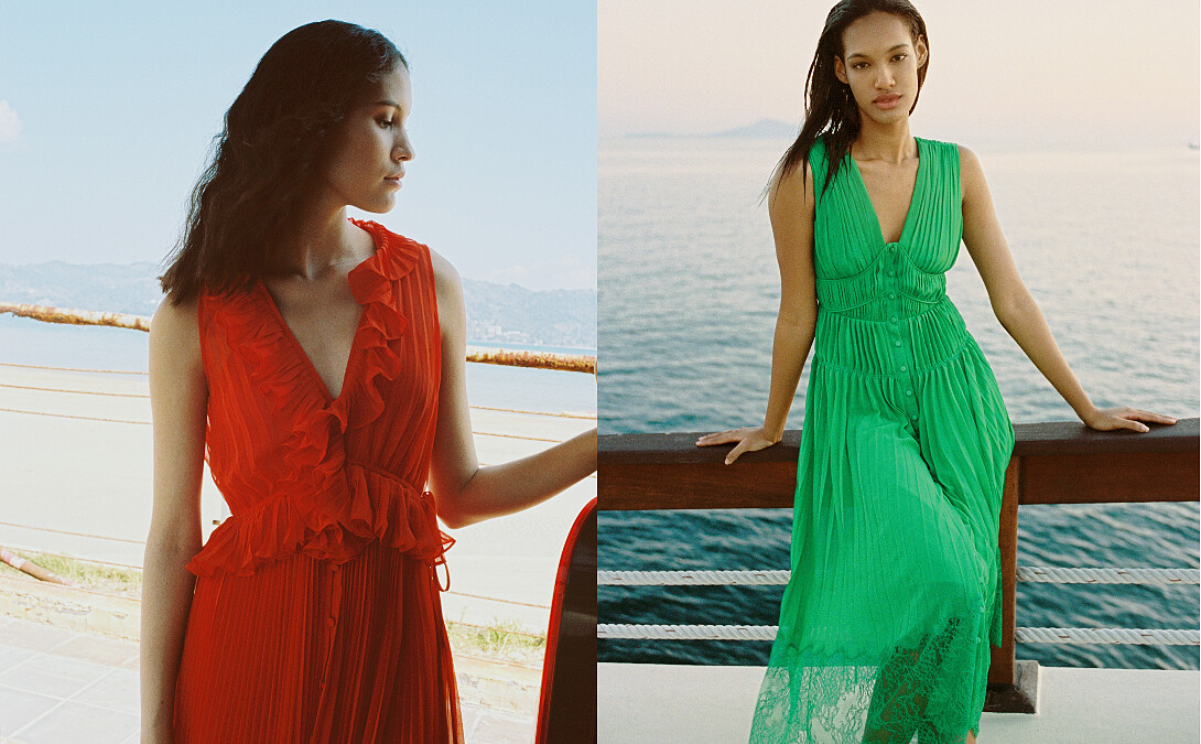鮮豔色調的輕透柔美雪紡紗質洋裝,也以各種細膩的百褶、抓皺、荷葉細節呈現,在海島自然景致下,顯得更為突出亮眼,營造出絕美的浪漫度假氛圍。