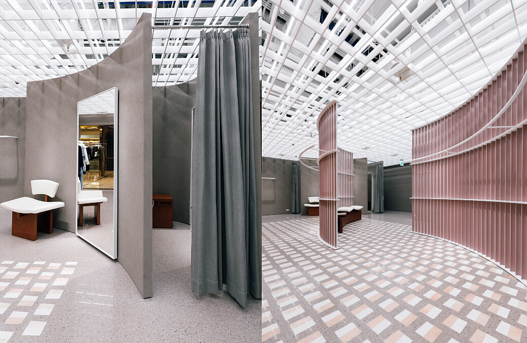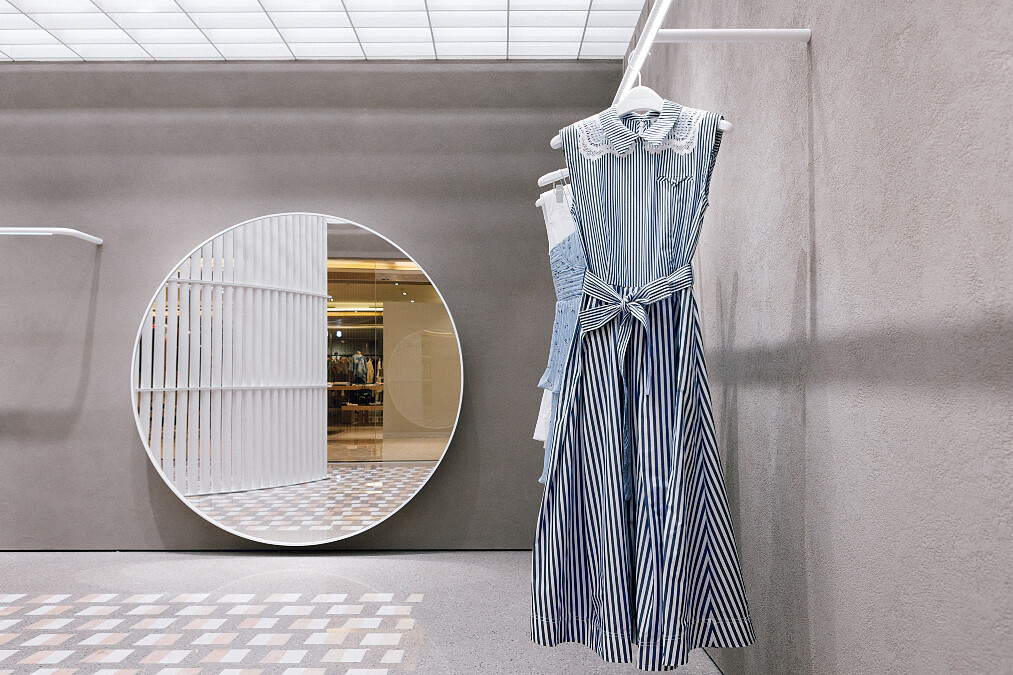 self-portrait微風信義旗艦店的店中設計,皆出自英國Mayfair旗艦店的名建築師團隊–Casper Mueller Kneer,承包過Celine首爾、東京、倫敦的旗艦店,以及倫敦著名的藝術館White Cube的大師級團隊,延續馬來西亞華裔設計師Han Chong對現代女性的想像,將方中帶圓、圓中帶方;剛中帶柔、柔中帶剛的概念,融入極簡美學的視覺觀,以溫婉暖灰牆面、來自葡萄牙的白色及淡粉鶴色奧羅拉大理石點綴空間,加上開放式的網格鋁料純白天花板,讓光影有如具體形體般垂瀉而下,使得旗艦店中的空間散出一股明亮柔和卻自帶個性的氛圍,逛起來更為舒適的同時也能感受品牌帶來的設計美學。