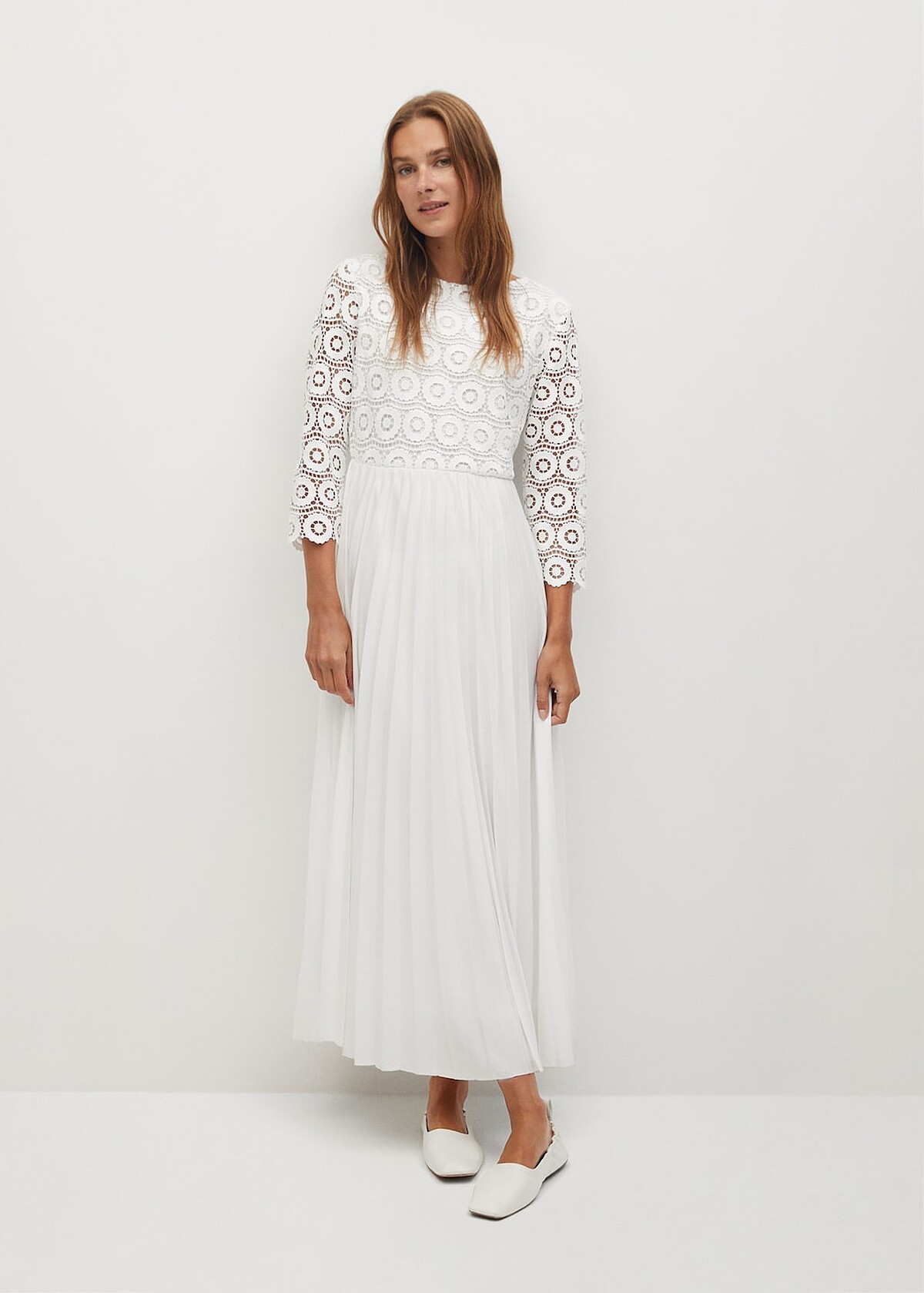 ▼白色蕾絲/刺繡洋裝推薦款式4:Mango Guipure midi dress,售價NT$3,990