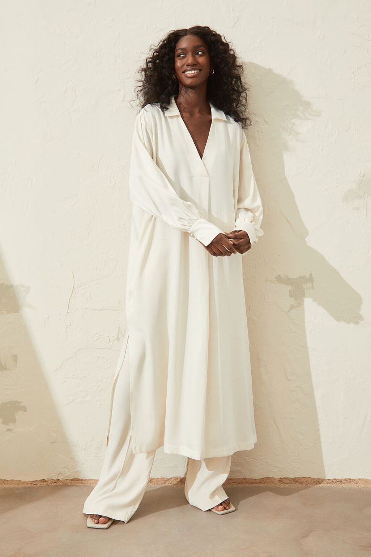 ▼白色西裝推薦款式2:H&M (上)寬鬆洋裝,售價NT$990/(下)鬆緊式寬管褲,售價NT$699