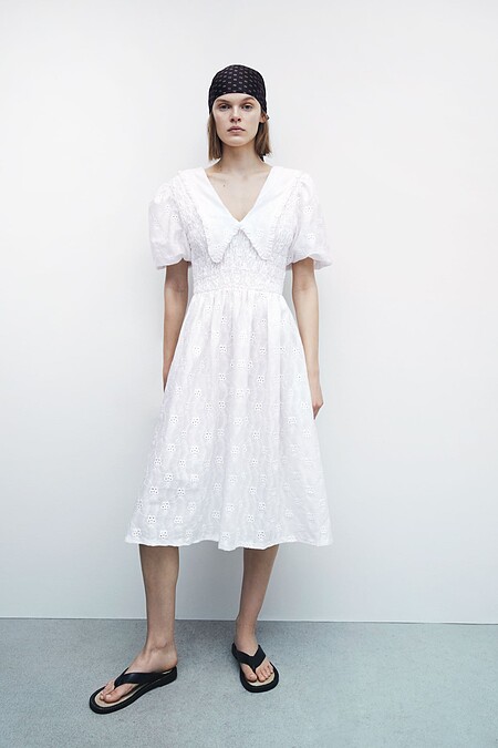 ▼白色蕾絲/刺繡洋裝推薦款式2:Zara 蓬袖中長版洋裝,售價NT$1,490