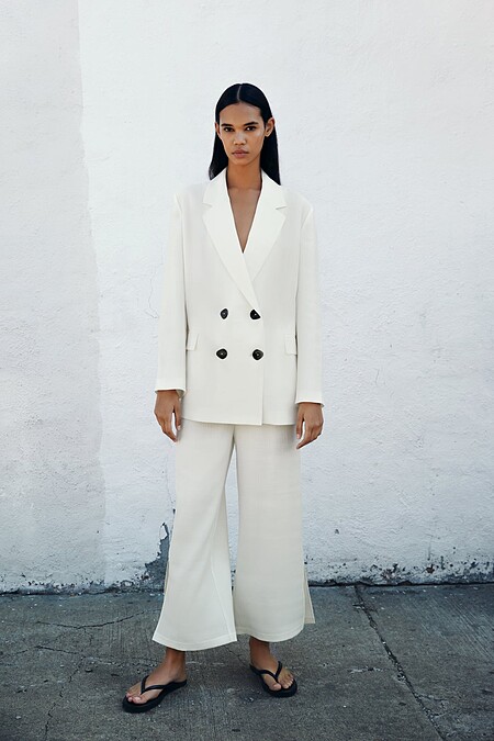 ▼白色西裝推薦款式1:Zara (上)褶皺效果雙排扣西裝外套,售價NT$1,990/(下)皺痕效果長褲,售價NT$1,490