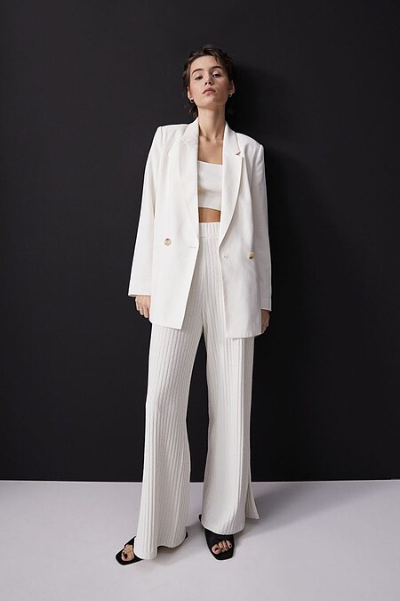 ▼白色西裝推薦款式3:H&M (上)雙排扣西裝外套,售價NT$999/(下)羅紋長褲,售價NT$699